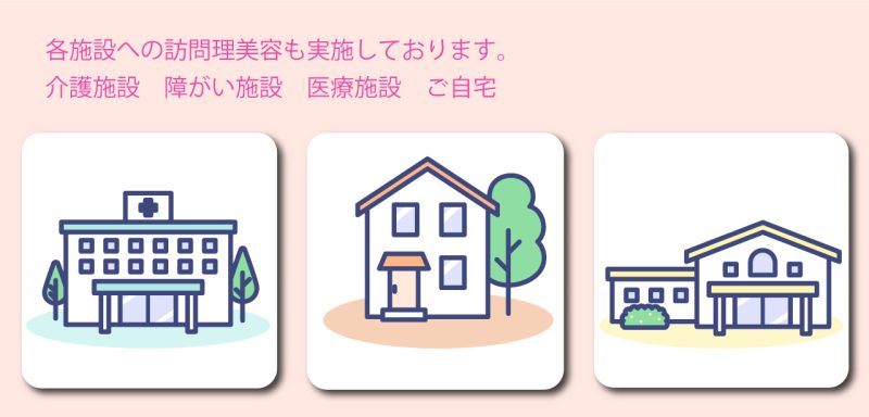 高齢や・障がい者(児)・病病等で外出が困難な方への美容室・理容室のご利用ができない方のご自宅・高齢者施設(有料老人ホーム・グループホーム・特養・老健・デイサービス施設)各、福祉施設、病院等に訪問させて美容室・理容室全般を提供するサービスです。