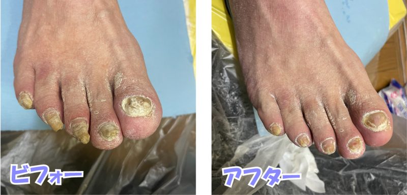 今まで靴下をはく事にも苦労してました。厚みのある切るのに、病院などに行くのも大変。このようなお悩みにも対応しています。厚みがある爪を削る事で、歩行も楽になり今まで以上に生活が楽になります。施術時間は個人差にもよりますが,1時間半ほどでおこなえます。フットケアは健康でいる為に必要不可欠です。